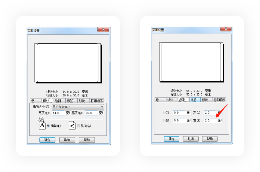 三、雙擊白色編輯區(qū)域設置標簽尺寸和實際放入打印機的標簽尺寸一致(例如:放入的標簽尺寸為50x30mm,設置如下圖)設置完點擊確定即可編輯內(nèi)容